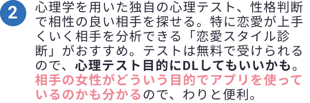 心理テストや分析でマッチする前から相手の性格などが分かるので、イイネの無駄遣いが少し減らせます。